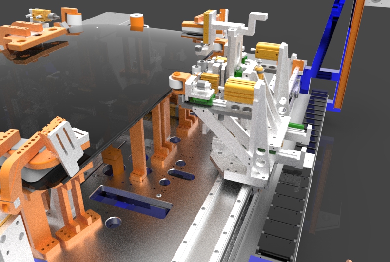 通常這種自動(dòng)化生產(chǎn)要采用機(jī)器人來(lái)完成,不過(guò)由于玻璃在生產(chǎn)過(guò)程中的形變完全無(wú)法控制在機(jī)器人的使用誤差以內(nèi),導(dǎo)致?lián)跛畻l與玻璃間在生產(chǎn)中產(chǎn)生縫隙,同時(shí)機(jī)器人結(jié)構(gòu)工裝占用的空間很大,給操作帶來(lái)了很大的不便。因此我公司開(kāi)發(fā)的這種滾壓機(jī)構(gòu)通過(guò)五軸聯(lián)動(dòng)滿足了擋水條在玻璃上的粘結(jié)功能,五軸聯(lián)動(dòng)會(huì)完全沿著玻璃的曲率把擋水條粘結(jié)在玻璃上,粘結(jié)后的結(jié)果不僅能滿足面差,而且還能保證擋水條在玻璃上的粘結(jié)力。